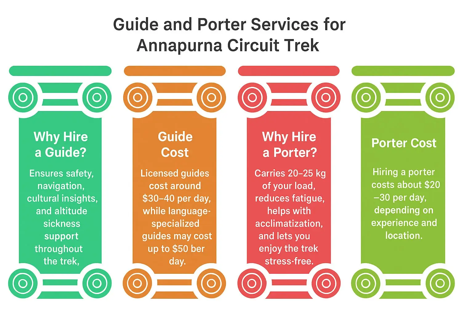 The cost of hiring a porter for the Annapurna circuit trek is 20 to 30 USD per day. The porter carries 20 to 25 Kg of your weight. If your weight exceeds the limit, you might need to pay extra. If you hire a local porter when reaching the starting point of the Annapurna circuit, you might find the porter more affordable.